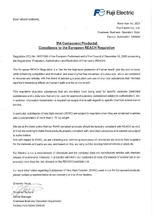 Fuji Electric is not a manufacturer of chemicals and the company does not manufacture articles with intended release of substances.