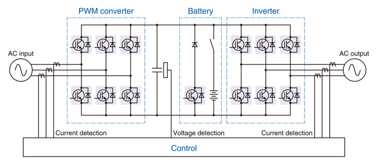 Uninterruptible power supply (UPS) devices prevent computer systems and medical equipment in banks, hospitals and elsewhere from shutting down during power outages and sudden blackouts. General UPS systems consist of a battery and a converter that uses an IGBT. Power supply systems are required to be highly reliable and efficient.
