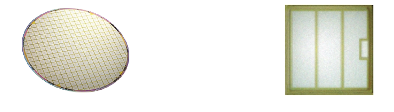 A wafer with electronic circuits formed on it (left) and a chip (element) (right) Note: Both photos are of Si