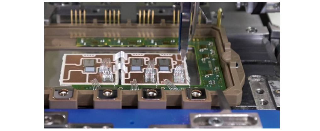 Wire bonding of IGBT modules using Si chips. Metal wires connecting the chip and terminal case are joined using an ultrasonic method to complete electric